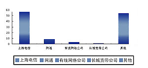 在國(guó)內(nèi),視訊市場(chǎng)的形成已經(jīng)初露端倪,眾多商家都開始瞄準(zhǔn)這個(gè)新的利潤(rùn)增長(zhǎng)點(diǎn)。2002年8月,上海電信正式將視訊業(yè)務(wù)命名為“新視通”,并陸續(xù)開通了上海至美國(guó)洛杉磯、新疆烏魯木齊、石河子、克拉瑪依等地區(qū)的公眾視訊業(yè)務(wù),同時(shí)還針對(duì)商用客戶和個(gè)人用戶啟動(dòng)了推廣計(jì)劃。由于上海是我國(guó)的貿(mào)易、金融、經(jīng)濟(jì)中心,許多國(guó)內(nèi)外的大型企業(yè)都在上海設(shè)有分支機(jī)構(gòu),市場(chǎng)潛力不可估量,眾多運(yùn)營(yíng)商都在爭(zhēng)取上海的市場(chǎng)。目前,除了上海電信推出的“新視通”業(yè)務(wù)外,網(wǎng)通、有線網(wǎng)絡(luò)和其它公司都在上海推出了自己的視訊系統(tǒng)。根據(jù)我們對(duì)企業(yè)用戶的抽樣調(diào)查,下圖的市場(chǎng)占有率表明了視訊業(yè)務(wù)的競(jìng)爭(zhēng)將會(huì)日益激烈。