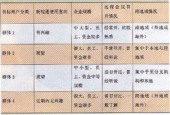 根據(jù)前一階段我們做的視訊業(yè)務(wù)市場(chǎng)研究,目前的主要目標(biāo)客戶可以定位為以下范圍:對(duì)于“新視通”會(huì)議系統(tǒng)感興趣的客戶,需要觀望的客戶以及雖然不感興趣但企業(yè)規(guī)模較大、存在著一定會(huì)議需求卻對(duì)遠(yuǎn)程會(huì)議不了解的客戶。通過(guò)對(duì)目標(biāo)群體的進(jìn)一步細(xì)分,我們將客戶聚類為四個(gè)主要群體: