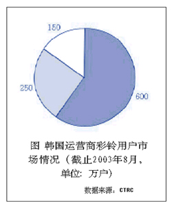 彩鈴業(yè)務(wù)最先是由韓國的SK電信于2002年3月推出的,業(yè)務(wù)一經(jīng)面世就吸引了移動用戶、特別是年青用戶群體的眼球,開通的用戶數(shù)和業(yè)務(wù)使用率呈指數(shù)式增長;同時由彩鈴業(yè)務(wù)帶來的互聯(lián)網(wǎng)、WAP和IVR的話務(wù)量的增長進(jìn)一步提升了彩鈴業(yè)務(wù)的含金量。隨后韓國的其他兩個移動運(yùn)營商LG電信和韓國電信也分別于2002年6月和9月相繼開通彩鈴業(yè)務(wù)。經(jīng)過運(yùn)營商和彩鈴的內(nèi)容提供商的前期市場推廣和運(yùn)作,目前已發(fā)展了近1000萬用戶,其中運(yùn)營商的市場份額如圖所示。