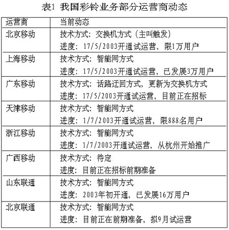 表1總結(jié)了目前我國部分運(yùn)營商彩鈴業(yè)務(wù)的發(fā)展動態(tài)。