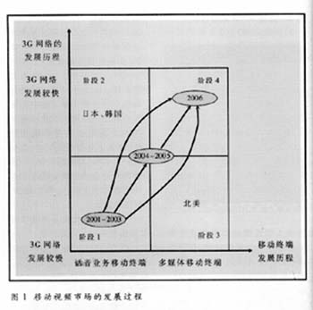 移動網絡和移動終端的發(fā)展將共同決定移動視頻市場的發(fā)展進程,主要包括四個發(fā)展階段,見圖1。