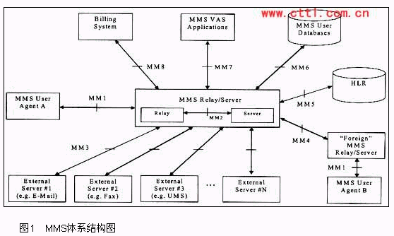 重復(fù)使用的原有網(wǎng)元有HLR,它通過MM5接口向MMSC提供用戶簽約信息。圖1列出了目前MMS系統(tǒng)中常用的接口是MMI-MM8。這些接口遵循相應(yīng)的接口規(guī)范。