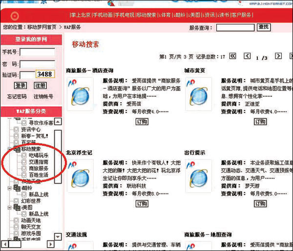 圖1 移動運營商網(wǎng)站上列出的移動搜索業(yè)務(wù)分類