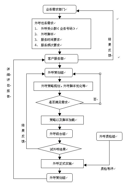 。。客戶服務(wù)部在受理業(yè)務(wù)部門的外呼業(yè)務(wù)需求書后,經(jīng)由呼叫中心外呼策劃班組進行策略規(guī)劃及外呼腳本編輯,并與業(yè)務(wù)需求部門進行溝通。在無歧意的情況下,將策略/腳本進行系統(tǒng)加載,啟動小批量試外呼,并進行策略與腳本優(yōu)化。外呼任務(wù)經(jīng)過外呼策劃班組進行策略及腳本化后,直接加載在外呼系統(tǒng)并分配給前臺班組進行正式外呼。
