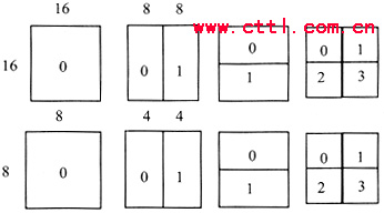 (1)塊的大小可變。在運(yùn)動估計時,可以靈活地選擇塊的大小。在宏塊(MB)劃分上,H.264采用了16×6,16×8,8×16,8×8四種模式;當(dāng)劃分為8×8模式時,又可進(jìn)一步采用8×4,4×8,4×4三種子宏塊劃分模式(見圖1)進(jìn)一步劃分,這樣做既可以使運(yùn)動物體的劃分更加精確,減小運(yùn)動物體邊緣的銜接誤差,又可以減小變換過程中的計算量。當(dāng)對較大的平滑區(qū)域采用Intra_16×16的幀間預(yù)測方式時,為減小小尺寸變換帶來的塊間灰度差異,H.264采用了對亮度數(shù)據(jù)的16個4×4塊的DC系數(shù)進(jìn)行第二次4×4變換,對色度數(shù)據(jù)的4個4×4塊的DC系數(shù)進(jìn)行22變換的方式。