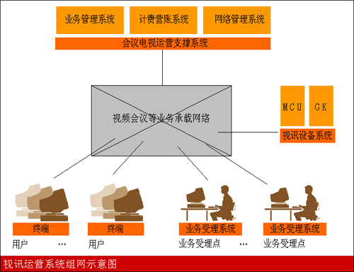 運(yùn)營(yíng)支撐系統(tǒng)的設(shè)計(jì)需要針對(duì)會(huì)議電視業(yè)務(wù)的特點(diǎn),為最終用戶(hù)提供方便、快捷的使用手段,同時(shí)為運(yùn)營(yíng)商提供全面、方便的管理功能,會(huì)議電視運(yùn)營(yíng)支撐系統(tǒng)主要包括業(yè)務(wù)管理、計(jì)費(fèi)營(yíng)賬、網(wǎng)絡(luò)管理等功能。完整的運(yùn)營(yíng)支撐系統(tǒng)需要考慮眾多的方面因素,如友好的操作界面、全面的可管理性、可維護(hù)操作性、有效的資源調(diào)度策略、靈活多樣的業(yè)務(wù)模式包括準(zhǔn)確實(shí)時(shí)的計(jì)費(fèi)統(tǒng)計(jì),都是其中非常重要的因素,缺一不可。右下圖為視訊運(yùn)營(yíng)系統(tǒng)的示意圖。