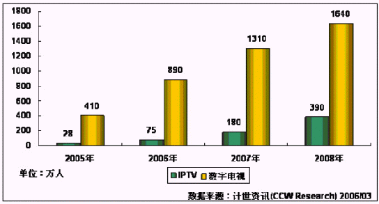當(dāng)然,從國際上看,電信和廣電的融合是主流趨勢,但從目前國內(nèi)的情況來看,由于牽扯到利益沖突,融合并非一句話的事,仍需要克服重重阻力。計(jì)世資訊(CCW Research)的數(shù)據(jù)顯示,在2005年IPTV的用戶只有僅僅28萬人,而廣電數(shù)字電視用戶已經(jīng)達(dá)到410萬人。相信在未來幾年內(nèi)這個(gè)比例很難有大的變動(dòng)。IPTV要想趕超數(shù)字電視還需要付出更大的努力。