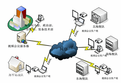 視維視頻會議系統(tǒng)應(yīng)用于海防團專網(wǎng)內(nèi),系統(tǒng)由服務(wù)器端軟件和客戶端軟件兩部分組成,為了滿足支持大容量會議人數(shù)、多會議同時召開以及流暢的音視頻交換的要求。視維網(wǎng)絡(luò)視頻會議系統(tǒng)在此方案中將采用1臺高端專用服務(wù)器作為視頻會議服務(wù)器,可容納多點同時開會,以確保系統(tǒng)的穩(wěn)定性和性能要求。,將服務(wù)器放置在主干/核心交換機上,使服務(wù)器和客戶端的路由/交換性能達到最佳效果。所有會議成員都需要在其個人計算機上安裝客戶端軟件。其網(wǎng)絡(luò)拓撲圖如下: