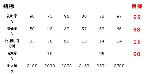 從滿(mǎn)意度的角度來(lái)看:5月份的指標(biāo)值已達(dá)到目標(biāo)值95%的要求,但只統(tǒng)計(jì)了2月份和5月份兩個(gè)月的數(shù)據(jù),數(shù)據(jù)收集不完整,因此,我們對(duì)該指標(biāo)無(wú)法評(píng)價(jià)(一般認(rèn)為對(duì)三個(gè)以下的數(shù)據(jù)無(wú)法做出評(píng)價(jià))。