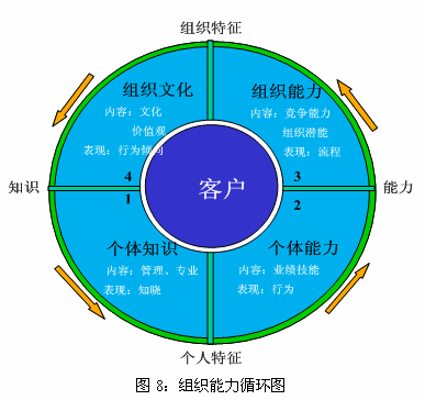組織能力循環(huán)圖說明,管理者不僅要關(guān)注對(duì)組織中個(gè)體層次特性的管理,如個(gè)體知識(shí)、個(gè)體能力,更要關(guān)注組織層次特性的管理,如組織能力和企業(yè)文化。只有管理者將目光由個(gè)體能力轉(zhuǎn)向組織能力時(shí),即更注重組織層次的能力建設(shè)時(shí),組織才會(huì)真正地成長和發(fā)展。