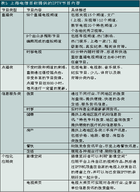 上海電信是國內(nèi)關(guān)注并切入IPTV業(yè)務(wù)較早的電信運營商之一,自2005年就開始積極測試和試驗。此次上海電信在全上海市范圍內(nèi)推出IPTV業(yè)務(wù),被業(yè)界看作是“中國IPTV規(guī)模商用的新紀元”。除了影視節(jié)目收看、視頻內(nèi)容點播、時移功能外,上海電信的IPTV服務(wù)還包括時事新聞、遠程醫(yī)療、視頻房產(chǎn)信息、餐飲信息、天氣預(yù)報、票務(wù)查詢等信息服務(wù)以及可視電話、IPTV游戲等個性化應(yīng)用。其中IPTV的直播頻道有58個,視頻點播可選節(jié)目量達3000小時以上。另外,上海電信還推出了影像空間和電視大黃頁等應(yīng)用服務(wù),攝像愛好者可以利用“影像空間”應(yīng)用平臺上傳自己的視頻作品,然后通過IPTV機頂盒在自家的電視上欣賞自己的得意之作,并可以與已安裝IPTV的親朋好友一起分享;電視大黃頁可實現(xiàn)對各類行業(yè)、企事業(yè)單位信息資訊的搜索查詢。