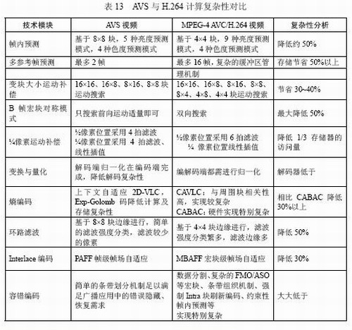 表13對AVS與H.264的計算實(shí)現(xiàn)復(fù)雜性進(jìn)行扼要對比,大致估算,AVS解碼復(fù)雜度相當(dāng)于H.264的30%,AVS編碼復(fù)雜度相當(dāng)于H.264的70%。