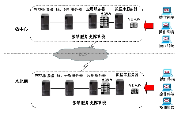 省中心/分公司營(yíng)銷服務(wù)支撐系統(tǒng)由兩臺(tái)IBM服務(wù)器形成雙機(jī)集群,同時(shí)安裝有數(shù)據(jù)庫服務(wù)器、WEB服務(wù)器、應(yīng)用服務(wù)器、統(tǒng)計(jì)分析服務(wù)器。