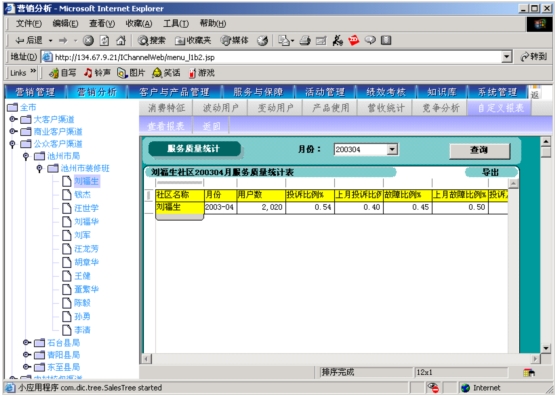 本系統(tǒng)通過對(duì)本地計(jì)費(fèi)帳務(wù)系統(tǒng)、網(wǎng)間結(jié)算系統(tǒng)、1000號(hào)客戶服務(wù)系統(tǒng)、“九七工程”系統(tǒng)、資源管理系統(tǒng)的動(dòng)態(tài)相關(guān)數(shù)據(jù)的提取,按日(天)記錄并分析開展?fàn)I銷服務(wù)工作所需的客戶基本資料、客戶關(guān)系資料、客戶收入信息、客戶消費(fèi)行為信息、客戶變動(dòng)信息、客戶障礙信息、客戶投訴信息、客戶競(jìng)爭(zhēng)動(dòng)態(tài)信息等支撐信息,指導(dǎo)各類客戶經(jīng)理開展有針對(duì)性營(yíng)銷服務(wù)工作。