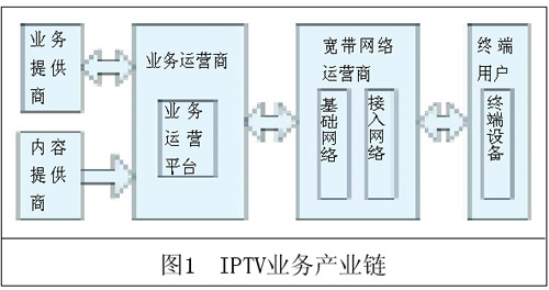 圖1所示的IPTV業(yè)務(wù)產(chǎn)業(yè)鏈中,主要角色包括內(nèi)容提供商/業(yè)務(wù)提供商(CP/SP)、業(yè)務(wù)運(yùn)營商、網(wǎng)絡(luò)運(yùn)營商和終端用戶。業(yè)務(wù)運(yùn)營商具有IPTV業(yè)務(wù)運(yùn)營資質(zhì),通過業(yè)務(wù)運(yùn)營平臺(tái)保證業(yè)務(wù)的提供和管理運(yùn)營,起著業(yè)務(wù)主導(dǎo)的作用;內(nèi)容提供商為業(yè)務(wù)運(yùn)營商提供內(nèi)容,業(yè)務(wù)提供商向業(yè)務(wù)運(yùn)營商提供增值業(yè)務(wù),使得業(yè)務(wù)中的內(nèi)容和種類豐富多彩以滿足用戶的不同需求,內(nèi)容提供商和業(yè)務(wù)提供商一般能根據(jù)用戶的使用情況獲取收入分成;