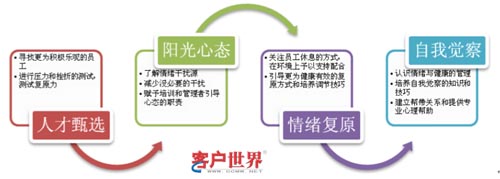 在上述的這三類員工中,我們更希望培養(yǎng)的是第一類,最不想見到的是第三類。但天生就具有很強情緒管理能力的員工,是可望不可求的。如果僅僅是依賴人員的天賦,管理也會陷入更多的“surprise”中,在幾百上千人的呼叫中心出現不可控的局面。我們需要的,也許是個系統(tǒng)化的工程,能夠直面呼叫中心員工需要“情緒勞動”的特點,從另外一個角度去理解和改善員工的表現,梳理各項相關工作,按照如下的步驟形成員工支持體系: