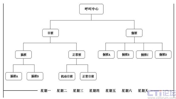 3)插班:插班人員的工作時(shí)間為8小時(shí),該組人員的工作時(shí)間,可根據(jù)呼叫中心績(jī)效分析文檔中的高峰呼叫量來(lái)安排。