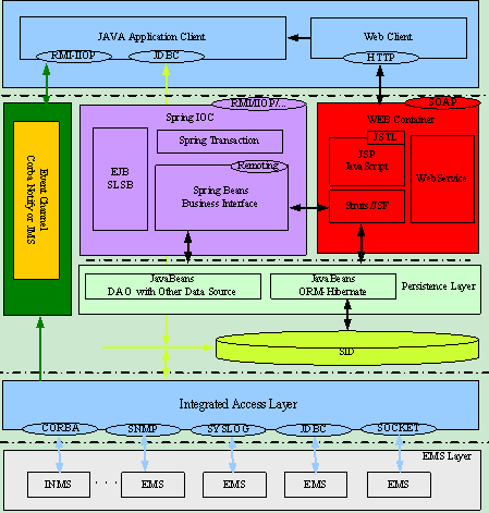 展現(xiàn)層分為兩類用戶界面,一種是Java Application類胖用戶界面;另外一種是純HTTP Web瘦客戶界面。Java Application頁面用于實現(xiàn)拓?fù)涔芾淼痊F(xiàn)階段不易于采用Web技術(shù)實現(xiàn)的交互頁面,與其他各層的交互協(xié)議主要采用RMI-IIOP或JDBC。
