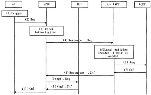 (4)如果業(yè)務(wù)請(qǐng)求被授權(quán),SPDF用本地策略和請(qǐng)求中攜帶的參數(shù)來(lái)決定怎樣處理請(qǐng)求。它可以發(fā)送Resource-Req給A-RACF,并發(fā)送bgf—Req給BGF;