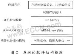 在系統(tǒng)硬件完成后,剩下的需要大量丁作來(lái)編寫(xiě)代碼實(shí)現(xiàn)各個(gè)功能模塊,最終實(shí)現(xiàn)整個(gè)系統(tǒng)。系統(tǒng)的軟件結(jié)構(gòu)如圖2所示。嵌入式OS是采用ARM-Linux內(nèi)核,硬件驅(qū)動(dòng)模塊主要是基于ARM 9的介于硬件和Linux內(nèi)核之間的軟件接口,為特定的硬件響應(yīng)定義好編程接口從而操作硬件,這2大模塊的技術(shù)目前已相當(dāng)成熟,相關(guān)的文獻(xiàn)非常多;音頻編碼采用G.711/729/723.1,是為了讓終端能適應(yīng)音頻編解碼的非對(duì)稱操作,有良好的兼容性,他可直接選用TI公司第三方提供的語(yǔ)音開(kāi)發(fā)軟件包。本文根據(jù)視頻電話終端的特點(diǎn)和當(dāng)前實(shí)現(xiàn)的技術(shù)難點(diǎn)主要討論視頻編碼H.264和SIP協(xié)議棧2大核心技術(shù)的硬件實(shí)現(xiàn)。