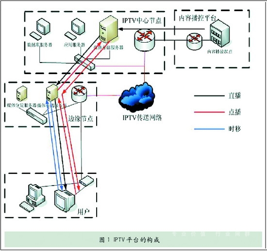 圖1中采用的是兩級(jí)架構(gòu),實(shí)際部署中,IPTV平臺(tái)可以采用多級(jí)架構(gòu),以減輕IPTV中心平臺(tái)的壓力,否則所有的時(shí)移電視、點(diǎn)播節(jié)目全部存放在中心平臺(tái)會(huì)嚴(yán)重影響用戶的收看質(zhì)量。