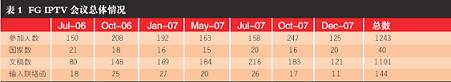 FGIPTV在一年半的時(shí)間里共召開(kāi)了7次會(huì)議,收到了1101篇文稿,參加者包括來(lái)自40個(gè)國(guó)家的1243名專(zhuān)家(見(jiàn)表1),其中既包括傳統(tǒng)電信網(wǎng)的專(zhuān)家,也包括來(lái)自廣播電視行業(yè)、IT業(yè)的專(zhuān)家,通過(guò)這7次會(huì)議、提交的文稿以及專(zhuān)家們的貢獻(xiàn),一方面產(chǎn)生了IPTV的定義,另一方面也形成了21個(gè)工作文檔,并根據(jù)這些文檔的內(nèi)容確定了負(fù)責(zé)此文檔的相應(yīng)研究組和課題(即Q/SG),詳見(jiàn)表2。