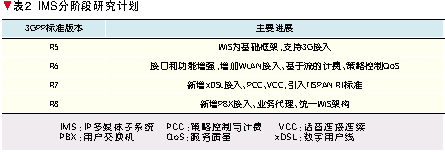 3GPP依照UMTS 3G移動(dòng)通信系統(tǒng)的系列標(biāo)準(zhǔn)版本定義了IMS的分階段演進(jìn)計(jì)劃[5],如表2所示。其中,2002年完成的R5是第一個(gè)全I(xiàn)P移動(dòng)網(wǎng)絡(luò)標(biāo)準(zhǔn),它將核心網(wǎng)歸為一個(gè)統(tǒng)一的基于IP的分組(PS)域,具有服務(wù)質(zhì)量(QoS)保證,能夠提供各種類(lèi)型的多媒體增值業(yè)務(wù),其核心技術(shù)標(biāo)準(zhǔn)就是IMS。R6進(jìn)一步完善IMS接口和功能,增加對(duì)于WLAN的接入支持,并研究IMS域的計(jì)費(fèi)和QoS控制技術(shù)。R7融合TISPAN關(guān)于NGN的研究標(biāo)準(zhǔn),增加對(duì)于xDSL接入技術(shù)的支持,提出策略控制與計(jì)費(fèi)(PCC)技術(shù)以及WLAN/3G語(yǔ)音連續(xù)通信的話音連接連續(xù)(VCC)技術(shù)。正在研究中的R8將協(xié)同各個(gè)標(biāo)準(zhǔn)化組織的工作,研究支持組合業(yè)務(wù)的業(yè)務(wù)代理技術(shù)以及下一步的統(tǒng)一IMS架構(gòu)。
