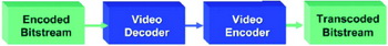 視頻轉碼是一個高運算負荷的過程,需要對輸入的視頻流進行全解碼、視頻過濾/圖像處理、并且對輸出格式進行全編碼。最簡單的轉碼過程(圖3)僅僅涉及到解碼一個比特流和用不同的編解碼器重新編碼兩個步驟。這種硬轉碼看似很簡單,只需要一個解碼器和一個編碼器,但是最終顯示結果并不理想,因為視頻數(shù)據解碼后重新編碼會降低畫質。
