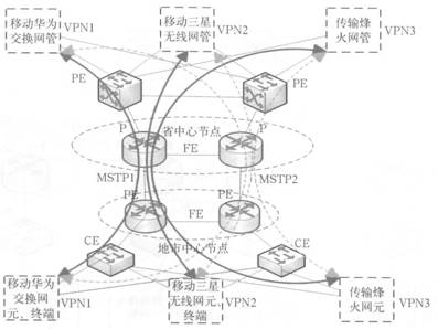 采用MPLS VPN技術(shù)可以把現(xiàn)有的物理實(shí)體IP網(wǎng)絡(luò)分解成邏輯上隔離的網(wǎng)絡(luò),各隔離開的網(wǎng)絡(luò)之間感知不到對(duì)方網(wǎng)絡(luò)的存在。在物理上是同一硬件設(shè)備承載,但在邏輯上網(wǎng)絡(luò)是完全隔離的。0SS承載網(wǎng)正是需要這樣的一種承載方式,把各專業(yè)各廠家的多種網(wǎng)管配置到不同的邏輯業(yè)務(wù)區(qū)VPN中,如移動(dòng)華為交換網(wǎng)管配置到VPNl中,移動(dòng)三星無(wú)線網(wǎng)管配置到VPN2中,傳輸烽火網(wǎng)管配置到VPN3中,對(duì)每一套網(wǎng)管系統(tǒng)都使用同樣的物理承載不同的VPN完成從地市分公司的網(wǎng)元或終端到網(wǎng)管服務(wù)器的連接,各VPN之間相互獨(dú)立、相互隔離。