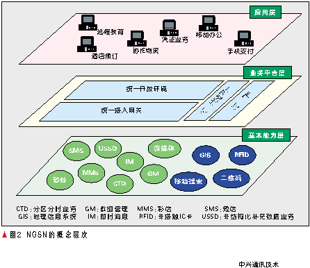 NGSN是為了適應(yīng)網(wǎng)絡(luò)和技術(shù)的融合趨勢、運(yùn)營商轉(zhuǎn)型的需求提出的,通過整合各種網(wǎng)絡(luò)業(yè)務(wù)能力,實(shí)現(xiàn)數(shù)據(jù)、業(yè)務(wù)、能力和管理的統(tǒng)一,從而能夠快速提供各種增值業(yè)務(wù)、協(xié)助運(yùn)營商在價值鏈中處于主導(dǎo)地位。其概念層次如圖2所示。