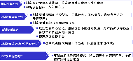萬丈高樓平地起,本項目由客服中心總經(jīng)理牽頭,副總經(jīng)理和部門經(jīng)理組成領(lǐng)導(dǎo)小組,全面審視中心運營管理現(xiàn)狀,探索“SECI知識循環(huán)管理”理論與實際工作結(jié)合點,針對客服中心滿意度提升的三大主要癥結(jié)勾勒出知識管理實施藍圖,試點階段和推廣階段,總體目標和階段性目標,監(jiān)控手段和評估指標等。