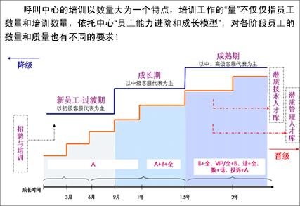 業(yè)務(wù)模塊化后,客服中心對一線客服代表進行分級認證,針對簡單業(yè)務(wù)和復(fù)雜業(yè)務(wù)分別設(shè)置首層和二線專席兩類共計8種人員承接梯隊,達到業(yè)務(wù)與人員的全匹配。人員梯隊的設(shè)置對人員的培訓(xùn)管理和進出機制提出了新的挑戰(zhàn),如何科學(xué)界定不同隊列人員的技能標(biāo)準(zhǔn)?如何設(shè)置不同成長時期員工的進出管理機制?