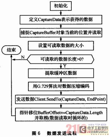數(shù)據(jù)發(fā)送函數(shù)的作用是將語音捕捉緩沖區(qū)的數(shù)據(jù)通過Client.SendTo(CaptureData,EndPoint)函數(shù)發(fā)送到網絡上。當線程發(fā)現(xiàn)有數(shù)據(jù)要讀取(即線程被觸發(fā))時,就會循環(huán)調用數(shù)據(jù)發(fā)送函數(shù),直到沒有可讀的數(shù)據(jù)為止。CaptureBuffer為語音捕捉緩沖區(qū)對象。數(shù)據(jù)發(fā)送流程如圖6所示。