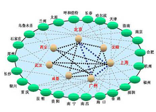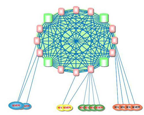 網(wǎng)絡(luò)扁平化概念就適時提出來了,F(xiàn)在,網(wǎng)絡(luò)扁平化已經(jīng)是運(yùn)營商網(wǎng)絡(luò)建設(shè)的主要指導(dǎo)思想了。特別是中國聯(lián)通,由于歷史原因造成的骨干網(wǎng)節(jié)點(diǎn)并不夠多導(dǎo)致其南北方網(wǎng)絡(luò)品質(zhì)存在一定差異。而扁平化后能很好的解決此問題。下圖為網(wǎng)絡(luò)扁平化示意圖。
