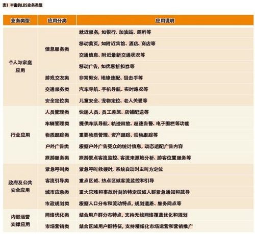 傳統(tǒng)LBS應(yīng)用主要是緊急呼叫、車(chē)輛導(dǎo)航、物流管理、人員定位等,其實(shí)LBS作為一種基本能力,可以擴(kuò)展到各類(lèi)業(yè)務(wù)應(yīng)用中。根據(jù)面向的服務(wù)對(duì)象的不同,LBS業(yè)務(wù)可以分為個(gè)人與家庭應(yīng)用、行業(yè)應(yīng)用、政府與公共安全應(yīng)用和運(yùn)營(yíng)商內(nèi)部運(yùn)營(yíng)支撐應(yīng)用四大類(lèi)型。每種LBS業(yè)務(wù)類(lèi)型都包括各類(lèi)豐富應(yīng)用(如表1),這里僅列舉部分應(yīng)用進(jìn)行簡(jiǎn)要探討。