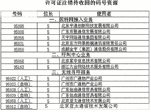 信產(chǎn)部公告稱,對(duì)這次經(jīng)營許可證注銷涉及的13個(gè)號(hào)碼,將依據(jù)《電信網(wǎng)碼號(hào)資源管理辦法》(信息產(chǎn)業(yè)部令第28號(hào))將予以收回。(高飛)