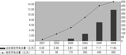有數(shù)據(jù)顯示,2002年企業(yè)短信市場總量為0.09億元,2003年增長到0.81億元,預(yù)計2006年將突破10億元。終于,中國移動和中國聯(lián)通先后推出了面向企業(yè)用戶的“集團短信”業(yè)務(wù),運營商對這個市場的重視使得一個新的產(chǎn)業(yè)鏈逐步完善起來,短信也開始“潤物細(xì)無聲”地改變著國內(nèi)企業(yè)的一些習(xí)慣。