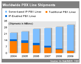 據(jù)In-Stat報(bào)告說(shuō),隨著IP線路出貨量今年有望超過(guò)傳統(tǒng)PBX,IP PBX進(jìn)入了一個(gè)新的成熟階段。雖然整個(gè)PBX市場(chǎng)預(yù)計(jì)將以6.6%的復(fù)合年增長(zhǎng)率增長(zhǎng)至2009年,但傳統(tǒng)PBX正在迅速下滑,IP PBX勢(shì)頭越來(lái)越強(qiáng)。