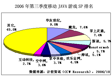 計世資訊(CCW Research)數(shù)據(jù)顯示,2006年第三季度中國手機(jī)游戲市場規(guī)模達(dá)到6.7億元人民幣,比第二季度增長11.9%。 手機(jī)游戲市場規(guī)模包括移動運(yùn)營商、手機(jī)游戲服務(wù)提供商在手機(jī)游戲業(yè)務(wù)上的總體收入,但不包括手機(jī)游戲軟件開發(fā)商的收入。第三季度,短信游戲增速繼續(xù)放緩,短信游戲市場規(guī)模達(dá)到1.8億元,占手機(jī)游戲市場份額的26.5%。WAP,JAVA和BREW游戲繼續(xù)保持快速增長,第三季度WAP、JAVA和BREW游戲市場規(guī)模分別為2.8億元、1.4億元和0.7億元。