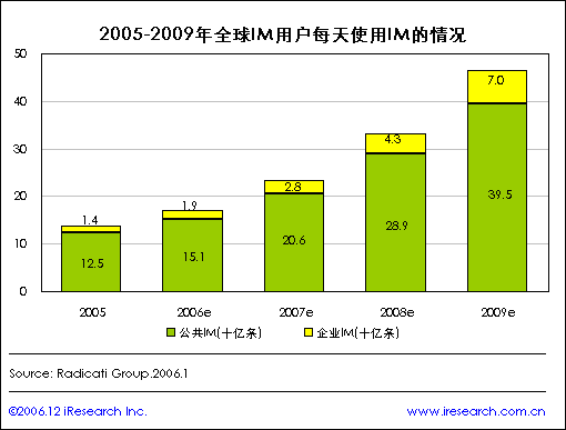 iResearch艾瑞市場咨詢根據(jù)Radicati Group統(tǒng)計顯示,到2005年底,全球總共有超過8.67億人在使用即時短信息軟件,到2009年,這個數(shù)字會增至12億。而整個IM市場(包括公眾IM和企業(yè)所用的EIM以及IM管理軟件)到2005年底將達(dá)到1.42億美元,到2009年更會增長到3.65億美元。據(jù)Radicati統(tǒng)計,目前每天網(wǎng)絡(luò)上發(fā)送的IM信息達(dá)139億條,其中125億條在公眾網(wǎng)絡(luò)上發(fā)送,14億條在企業(yè)內(nèi)部通過EIM發(fā)送。從IM軟件用戶的增長趨勢可以預(yù)測出,到2009年,網(wǎng)絡(luò)上每天發(fā)出的IM信息數(shù)量將達(dá)到465億條,其中395億條在公眾網(wǎng)絡(luò)上傳輸,其余70億條在企業(yè)內(nèi)部傳輸。