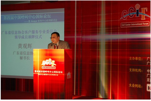 由廣東省信息協(xié)會(huì)、廣東省電子商務(wù)協(xié)會(huì)聯(lián)合主辦,廣東省信息協(xié)會(huì)客戶服務(wù)專(zhuān)業(yè)委員會(huì)、廣州市品派文化傳播有限公司策劃承辦,AVAYA公司總協(xié)辦的第四屆中國(guó)呼叫中心國(guó)際論壇于2007年1月23日在廣州亞洲國(guó)際大酒店隆重舉行,廣東省信息產(chǎn)業(yè)廳副廳長(zhǎng)俞建飛出席會(huì)議并致開(kāi)幕詞。會(huì)上,廣東省信息協(xié)會(huì)秘書(shū)長(zhǎng)黃觀輝、AVAYA公司銷(xiāo)售總經(jīng)理?xiàng)畛、民生銀行電子銀行部華南運(yùn)營(yíng)中心總經(jīng)理李濤、網(wǎng)易客戶服務(wù)部總監(jiān)張?jiān)频确謩e做了主題發(fā)言。來(lái)自全國(guó)各地300多位企業(yè)管理人員參加了本次論壇。