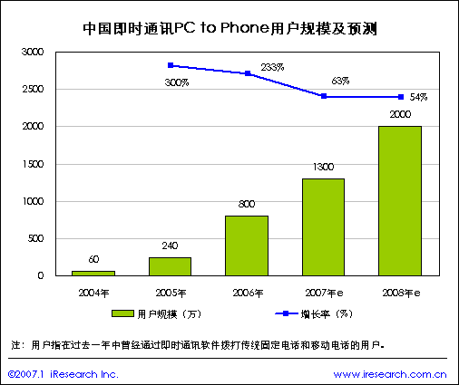 近兩年此類(lèi)業(yè)務(wù)形式逐漸被網(wǎng)民所接受,據(jù)iResearch統(tǒng)計(jì),2004年中國(guó)通過(guò)即時(shí)通訊軟件撥打普通電話(huà)的用戶(hù)僅為60萬(wàn),2006年用戶(hù)達(dá)到800萬(wàn)。如果國(guó)家相關(guān)政策可以進(jìn)一步開(kāi)放,PC to Phone 的用戶(hù)規(guī)模將會(huì)迅速增長(zhǎng)。