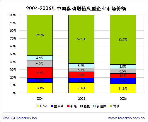 iResearch艾瑞市場咨詢最新的研究成果顯示,2004-2006年,在中國的移動增值市場中,TOM、新浪的市場份額處于不斷下降的趨勢,其中下降最明顯的是新浪網(wǎng),它的市場份額已由2004年的14.4%下降到2006年的5.9%,但與此同時空中網(wǎng)的市場份額卻處于增長趨勢,已由2004年的5.6%增長到2006年的7.3%.