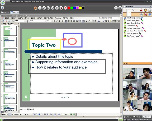 2.在多人會(huì)議的環(huán)境下,vzRoom同時(shí)支持多種實(shí)時(shí)信息分享,包括網(wǎng)頁(yè)、相片、文件、圖表和簡(jiǎn)報(bào)等,配合內(nèi)置畫筆功能,方便解說(shuō)。