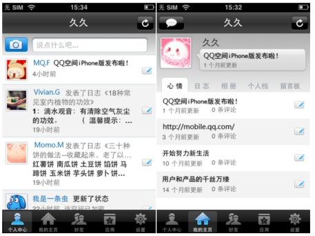 QQ空間foriPhone的外觀界面完全繼承了iPhone上應(yīng)用軟件的清新簡潔風(fēng)格,軟件主界面包括個(gè)人中心、我的主頁、好友、應(yīng)用、設(shè)置五大功能。點(diǎn)擊個(gè)人中心可以看到自己的狀態(tài)、簽名以及好友的最新動態(tài)。并且可以直接使用置頂?shù)呐恼真I拍照,即時(shí)拍照上傳至空間,使用置頂?shù)男那檩斎肟蛴涗涀约旱男那椤?br />