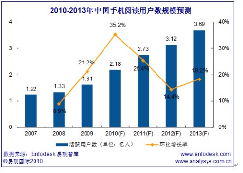 中國(guó)手機(jī)閱讀市場(chǎng)2010年在運(yùn)營(yíng)商閱讀基地的推動(dòng)下,收入規(guī)模相比2009年有快速的增長(zhǎng),增長(zhǎng)幅度達(dá)60.4%。預(yù)計(jì)2013年中國(guó)手機(jī)閱讀市場(chǎng)銷售規(guī)模將達(dá)到65.31億元,活躍用戶達(dá)到3.69億人。