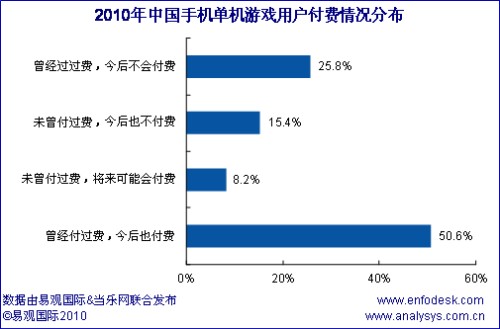 根據調研顯示,手機單機游戲中,有76.4%的用戶都有過付費經歷,但有25.8%的用戶表示今后將不在付費,出現這種現象原因有多種,主要還是存在損害用戶行為經常發(fā)生,外加上眾多與PC交叉用戶的涌入,而這些用戶中免費的、盜版的、破解的成為他們的首選,因此預計未來單機游戲的付費比例還將下降。