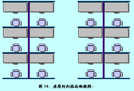 。。在此格局中,客服代表采用兩兩面面相對(duì)的方式進(jìn)行辦公,但位于同一側(cè)的客服代表是相同面向的。