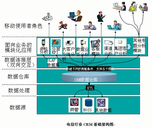 電信行業(yè)早期的CRM系統(tǒng)主要是由單一的多維分析子系統(tǒng)組成,比如移動(dòng)總公司最早的CRM系統(tǒng)就僅僅規(guī)范了以多維分析為標(biāo)準(zhǔn)的九大主題分析。隨著移動(dòng)電信市場(chǎng)的迅速增長(zhǎng),復(fù)雜程度越來(lái)越高,更多的子系統(tǒng)被添加進(jìn)來(lái),IT系統(tǒng)建設(shè)中模塊化的思路通過(guò)數(shù)據(jù)集市的方式在CRM建設(shè)中體現(xiàn)明顯。