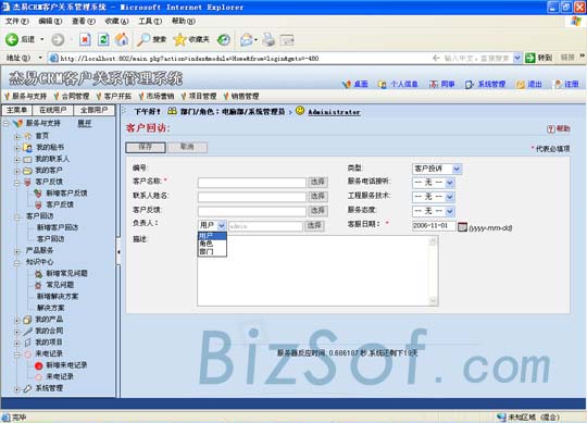 頁面的最頂端將本系統(tǒng)分為服務(wù)與支持、合同管理、客戶開拓、市場營銷、項目管理、銷售管理六板塊進行陳列以方便管理,同時左側(cè)是詳細(xì)的樹形結(jié)構(gòu)圖,所有功能一目了然。本系統(tǒng)實現(xiàn)了將不同業(yè)務(wù)、客服人員涉及的客戶資料進行了全面而且條理的整理匯集,整合團隊的力量提供完善的服務(wù)。